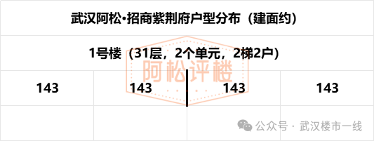 1号楼共31层,2个单元,2梯2户,均带电梯前室,均为建面约143平精装房源。