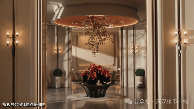 走在项目公区中,随意一瞥,都能带来美的感受,无论巨幅吊灯的勃勃生机,还是细节壁灯的典雅辉煌,再搭配不同色泽、基底暗纹的石材背景,处处彰显低调而隐奢的美感。