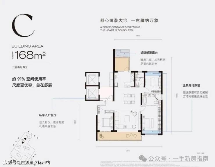 C户型168㎡三房:全明格局,客厅朝南,卧室朝南,明厨明卫,大面宽阳台。