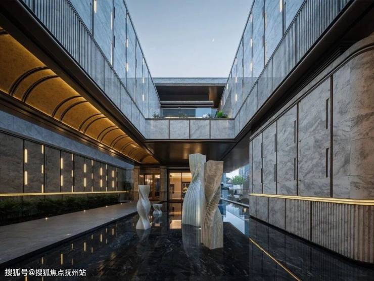 进入小区后,约6.5米深的下沉式“峡谷瀑林”将“城市山林”的构想化为实景。约400吨天然景石精心垒砌成峰,力求呈现“虽由人作,宛自天开”的自然意境。从地下一层步入归家之路,穿过地库光厅,便抵达了静谧的哲学水厅。