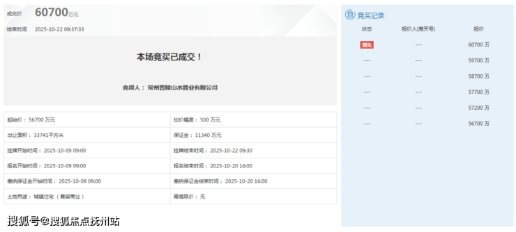 该项目即乌衣浜及周边地块,于2025年10月22日成交,楼面单价15643元/㎡,竞得单位为常州晋陵山水置业有限公司。