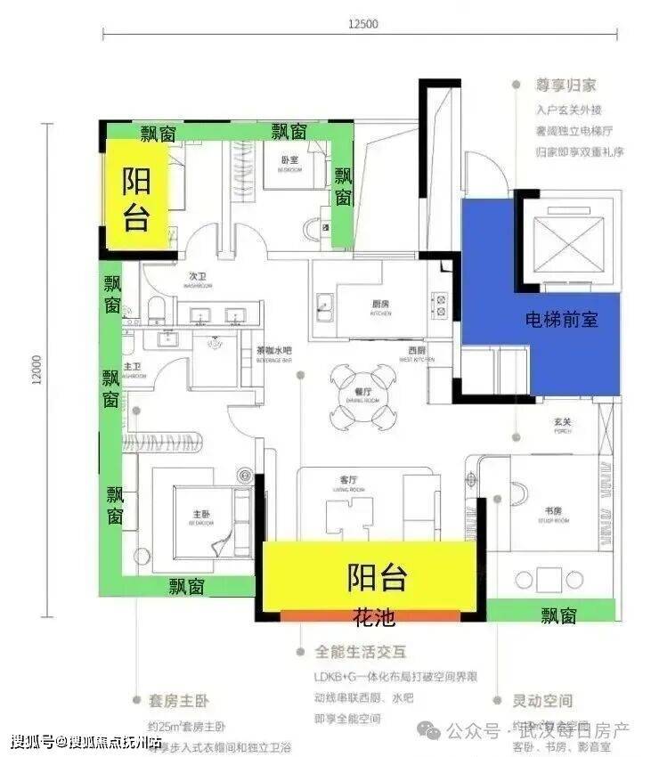超大电梯前室,出电梯就仪式感满满;客餐厅270°拐角大阳台+270°拐角大花池,拓展出约59平的宴会级社交场域;除客餐厅外,其它房间均有飘窗优化空间,切实做到了360°空间赠送;主卧和北向次卧,实现了少有的双面飘窗或飘窗+生活阳台的双面空间优化……