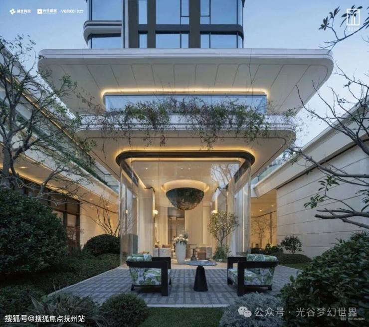 社区主入口以“浮岛”为设计理念,连接繁华的商业界面,营造了开放、轻松、自由的街区氛围。入口设计犹如自然生长的悬浮浮岛,构建了强烈的社区昭示感,步入示范区,酒店式落客区与雅奢大堂内外呼应,完成了“城市喧嚣到静谧岛居”的情绪转换。不同高度的出挑平台,创造了层层叠绿的立体空间,一座向上生长的悬浮岛屿,让植被不再是孤立的摆放,建筑与自然错落有致,层层递进,予以时光生机。