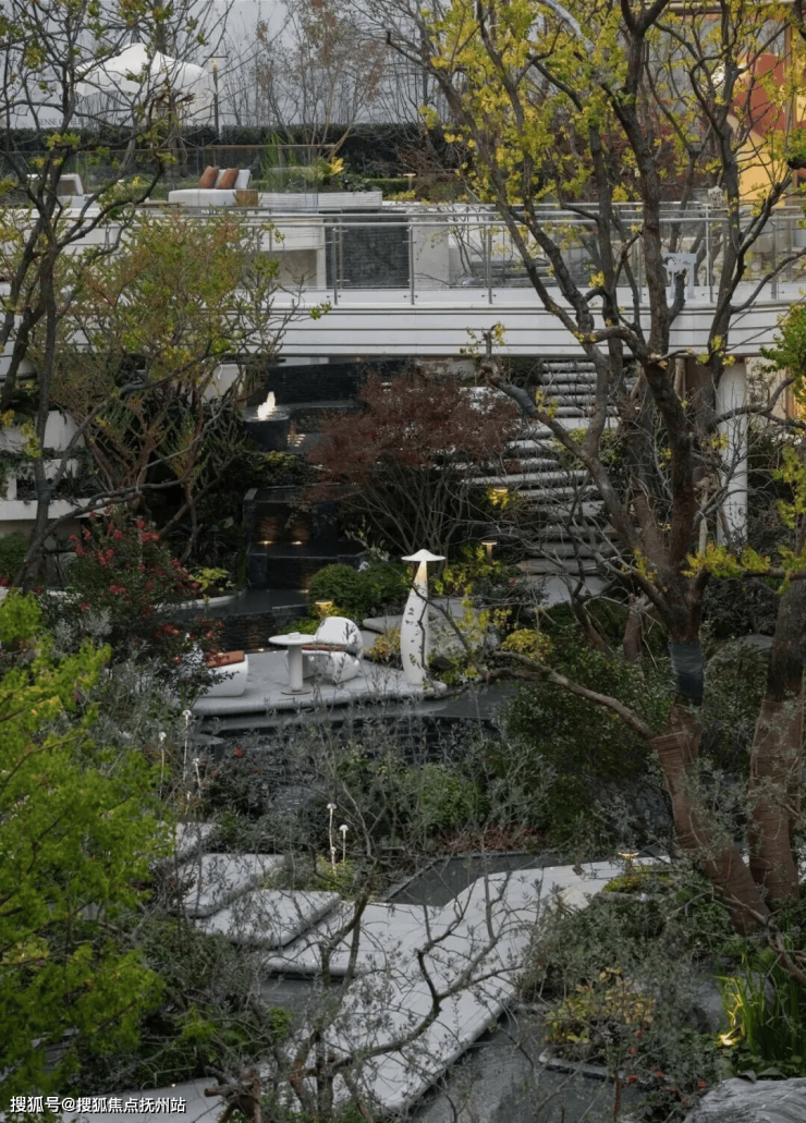 景观动线自百合花房被巧妙引向更富野趣的水岸。一座溯溪平台临水而设,是静观之所的同时,更将溯溪的探索之趣融入现代生活。静观庭院四季流转,午后可于此沐浴暖阳,看叠瀑水光潋滟;夜晚,则在星月与水声的环绕中,享受一份都市难得的静谧。