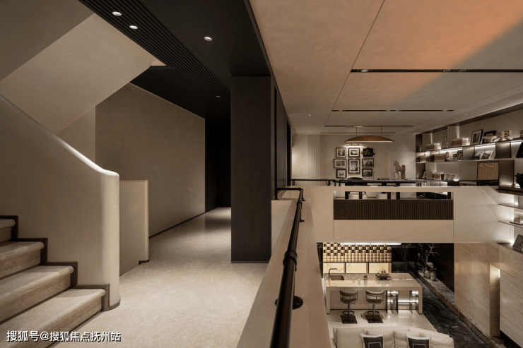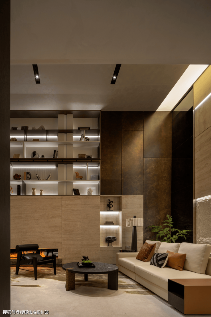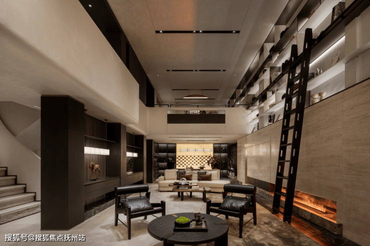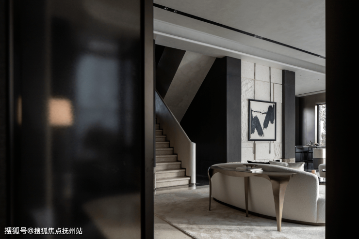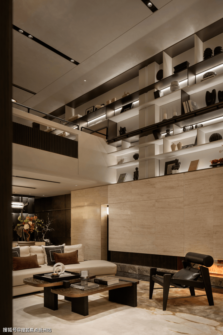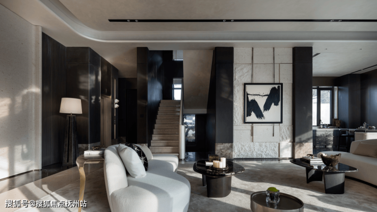 客厅空间开阔,挑高设计增加了空间的层次感和通透感。选用了具有现代简约风格的家具,线条流畅简洁,材质上则注重质感,如柔软的布艺沙发搭配金属质感的茶几,刚柔并济。