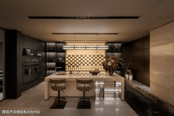 此外,餐厅还设置了一个餐边柜,用于收纳餐具和展示酒品,既方便拿取物品,又增加了空间的通透感。