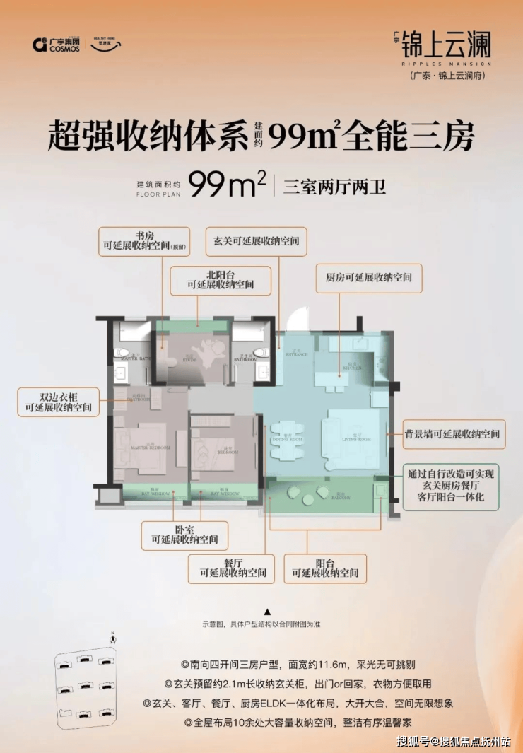 总价239万元建面约99㎡装标3000元/㎡,配置包含全屋中央空调、新风系统等。小区体量不大,规划9栋高层,共918户,主力户型建面有99-121方,及少量160方顶楼房源。锦上云澜建筑外观以城市封面标准设计,配置的是双色铝板外立面,同级豪宅品质。