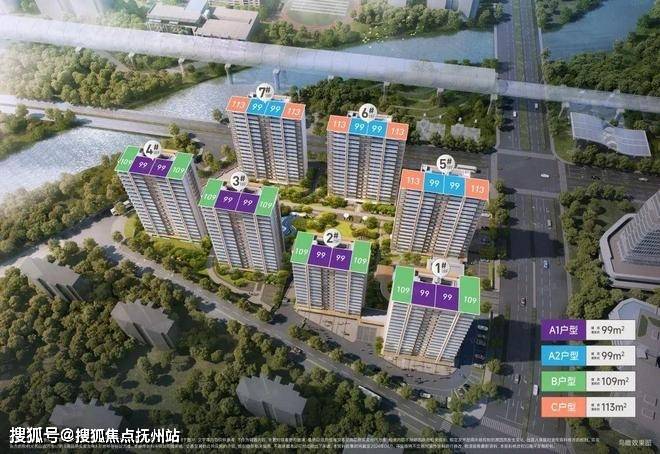 现在我们看到的是建面约99㎡的三室两厅两卫户型,户型设计利用率非常的高,设计为两梯四户,三开间朝南、南向双阳台,整体户型方正,此户型分布在每幢楼中间套位置。