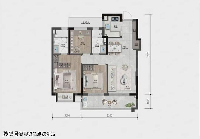 整体户型设计动静分离,既保障了餐客厨区域的联动性又保障休息区的私密性。
