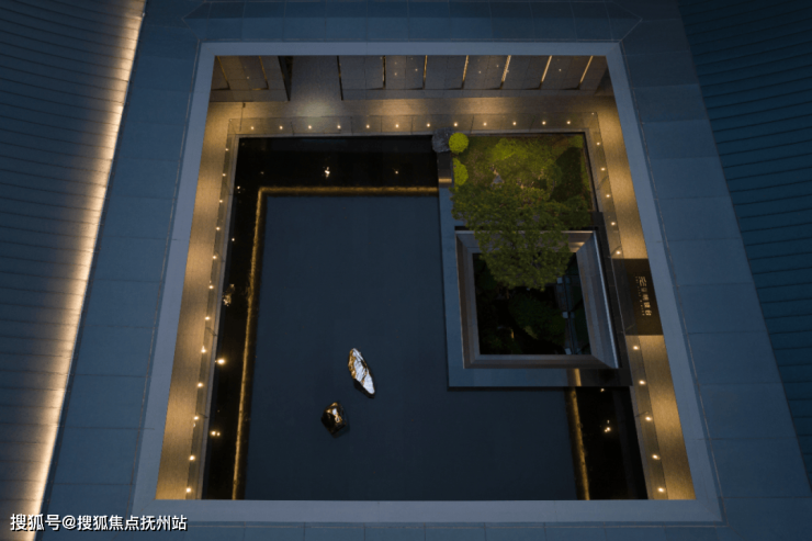 一进水院,所有的建筑落地,傍晚时分的黄昏和清晨耀眼的阳光都会倒影到水面上,百年典藏的松树私藏在这样一个院落里面。