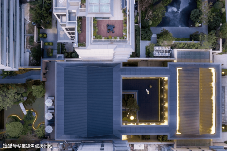 从空间构造来看,项目打破传统设计中的建筑方正格局,特意留出约2000㎡核心中庭打造公共体验院落,更在其下挖掘约1300㎡的地下复合型会所功能空间,以“三进四院”的礼序递进及多层复合的空间营造,带来诗意且放松的归家体验。