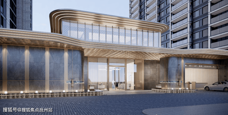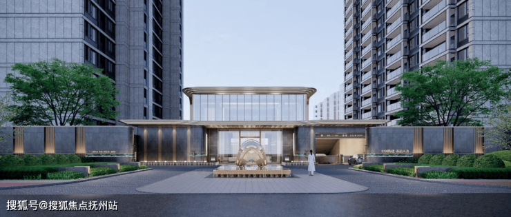 一面即为主入口景观面,作为花语天著归家第一站,主入口以高级灰和香槟金为底色,既体现主入口恢弘气势,又营造典雅的归家氛围。入口以两侧迎客松树阵、涌泉水景、景观雕塑,彰显尊崇序列感和归家仪式感。