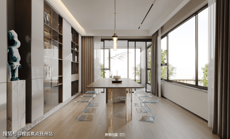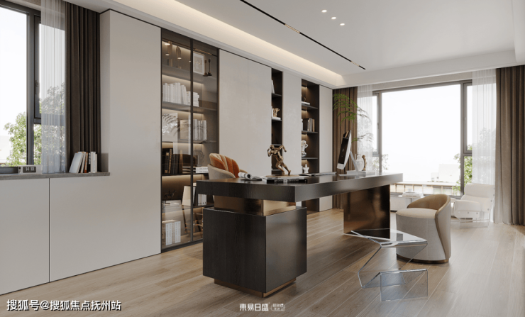 ▷休闲区装修设计:经过书房就来到了休闲区,这里没有既定的标准,品茶、畅聊......做一切你想做的。在设计上,与书房的思路基本一致,保留两面通窗的采光,家具与地板选择同色系搭配。整体舒适感极佳。
