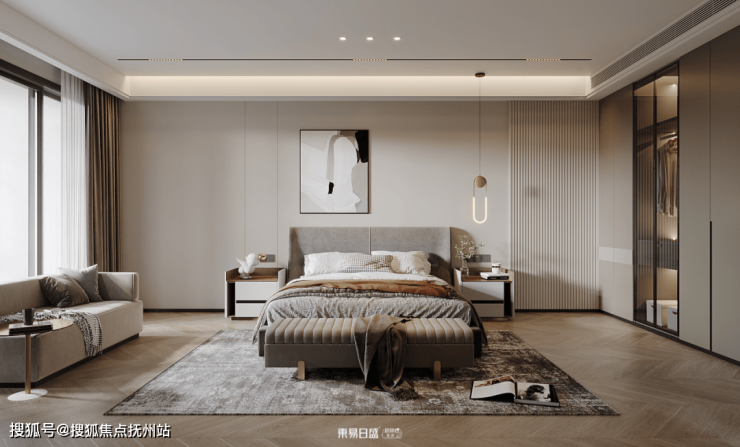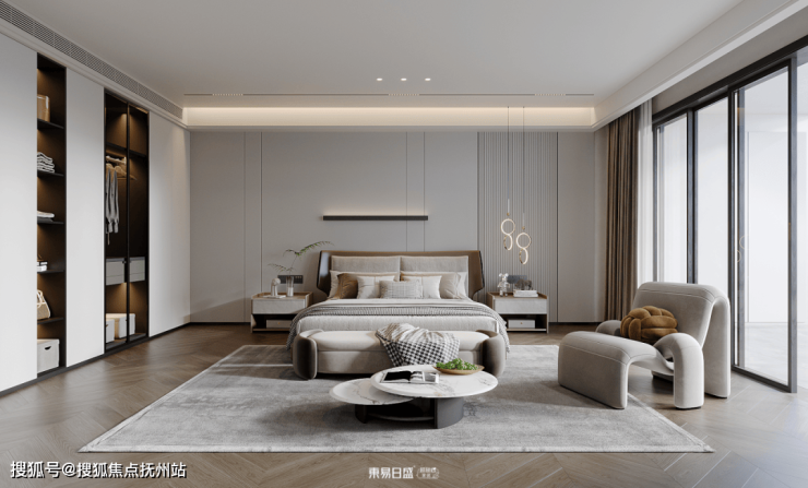 ▷主卧装修设计:主卧的设计上更注重居住的舒适度,阳台的自然光毫无保留的被引进室内,宽敞的格局让房间的通透感极佳,一门到顶的衣柜也为视觉连贯性提供了强有力的支撑。因为空间较宽敞,空余的区域也可以作为一个mini的休闲区~