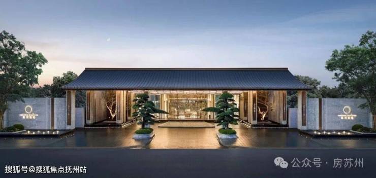 凤起冕旒|东方礼序的当代演绎;主入口门头以古代礼冠“冕旒”为灵感,采用现代设计语汇,构筑约85米“凤起冕旒”华贵门仪。景泰蓝垂幕「旒珠振玉」镶嵌其间,既呼应传统东方礼制,亦致敬苏州的时代封面与源点气质。门庭景观取罗汉松、朴树等珍稀树种,将奢石、水景与自然精巧融合,构筑一方承袭千年盛韵的尊荣之境。