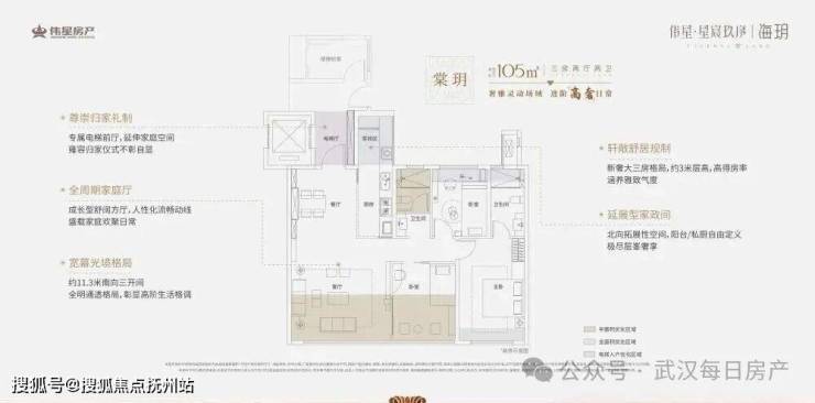 建面约105㎡「棠玥」:三房两厅两卫。这个面积段做三房两卫,在传统户型里是很勉强的,要么有一个房间小得像储物间,要么只有一个卫生间。但得益于超高得房率,它的每个功能空间都足够舒展,主卧甚至能做套房设计。这是对刚改客群的巨大诚意。