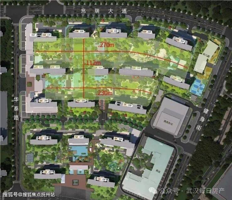 整盘约26.5万方,分两期开发。这是什么概念?在汉口江岸核心区,这是近些年罕见的“超大体量完整腹地”。二期单独拿出来,也有约15.6万方,12栋住宅,全部15-33层,没有超高层。