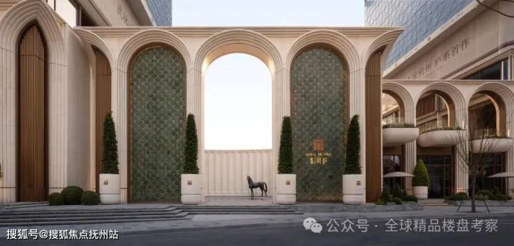 项目采用12米高拱券大门、宝格丽绿石材与古铜金属线条交织,形成迎宾序列;意大利贝金米黄石材弧形景墙与铜马雕塑传递“龙马精神”寓意。近十二米通高的拱券,通体以石材打造,层层叠涩,气势恢宏。