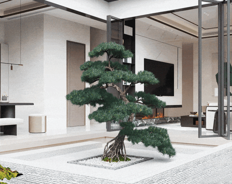 “溪流渺渺净涟漪,鱼跃鱼潜乐自知。”宁静的一隅游鱼在静静等待居者归家。闭眼仿佛可听锦鳞出水,睁眼隐然可观游鱼逐浪,虚实相生的造景成就一场空间和时间的对话。