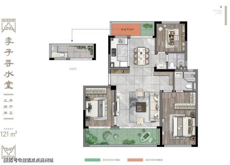 建面约121㎡三房两厅两卫:放大版的98㎡户型,在此基础上,有两点变化。①北向设备平台可以适当改造,延伸厨房和餐厅的空间;②主卧飘窗没有了,但空间感更强了,也更加实用。