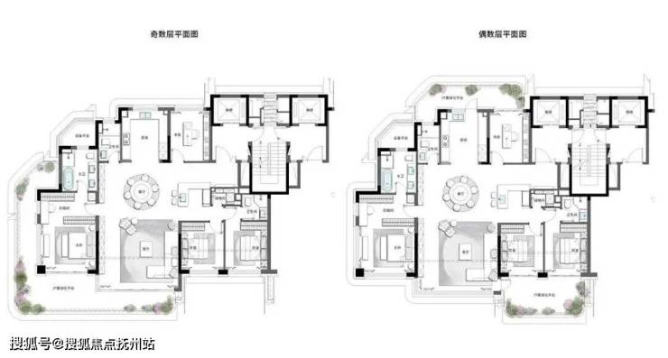 户型①上叠280 m²精装修风格为国际雅奢风格,由LSD设计,打造强社交感的上叠样板间, 独立中、西社交餐厨、客厅与露台空间联动、配置主卧独立衣帽库、私区家庭厅、花园露台场景等。