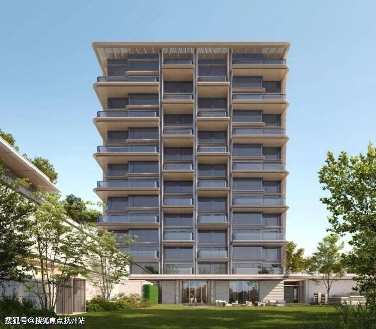 以 “现代极简 + 东方韵律” 为核心:水平线条搭配香槟色装饰线条,大面积玻璃 + 金属包边,错层空中绿化平台结合格栅意象,轻盈通透兼具东方雅致。高层住宅的露台出挑兼顾采光的均好性&实用性、立面整体协调性与建筑美感。