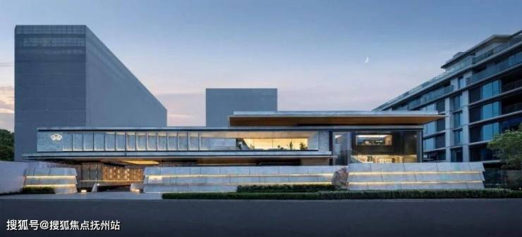 小区主入口面向明昕公园,设计创新性地将会所布置于街边取代了传统小区围墙,会所中光与人影的美好场景融入了城市界面。归家动线始于有对称仪式感的门廊和悬浮“华盖”之下。入口空间与社区会所功能得以密切整合,以现代手法营造出酒店化的度假场景。