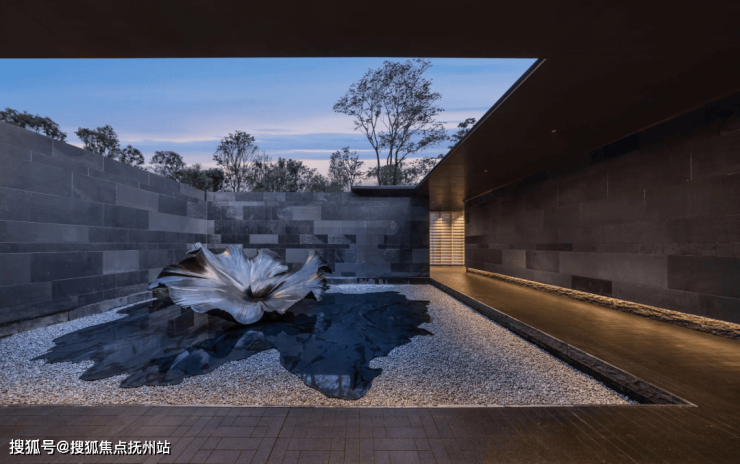 穿过门廊,便步入内侧的四方坡顶天光庭院,仿佛踏入了《桃花源记》中“山有小口,仿佛若有光”的境界。庭院对景是自然肌理的景墙、灵动的水景、挺拔的黑松以及大型置石,它们共同营造出一种氛围,实现了从繁华街道到宁静园区的情绪转换。