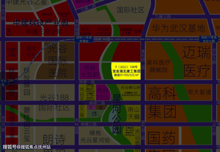 因此,在2022年12月16日的光谷土拍中,P(2022)108这宗绝版地块,经历了9次竞拍,竞得总价11.999亿元,溢价率约3.45%,楼面价约10525元/㎡,最终幸运的落到了实力强劲的宝业集团手中,瞬间引爆整个光谷地产圈!