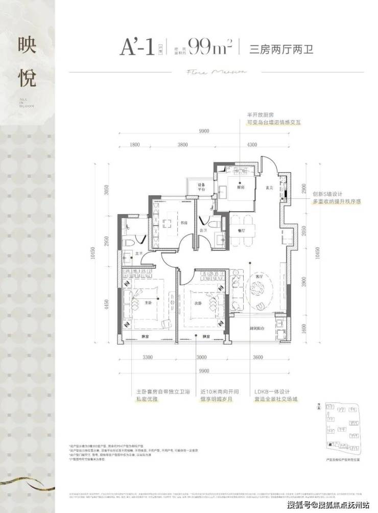 起步户型面积99㎡,现在在市场上已比较少见,做了三房两厅两卫,三开间朝南,各个空间的舒适性都还不错。重要是的总价可控,入住门槛仅300万元上下。