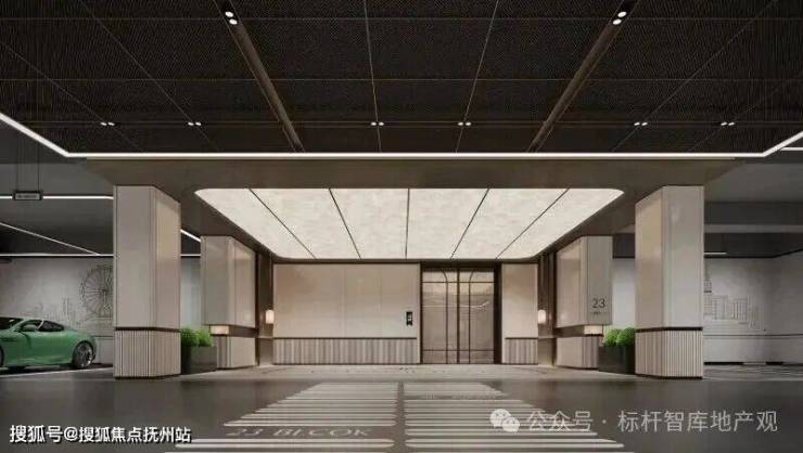 车库内也实现美学升级:利用线性灯光提升指引效果,以氛围灯光营造更舒适的光影环境。架空车库车马厅增加艺术造景,以提升归家体验、增强仪式感。