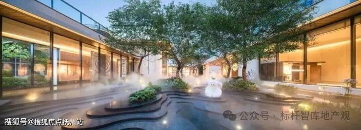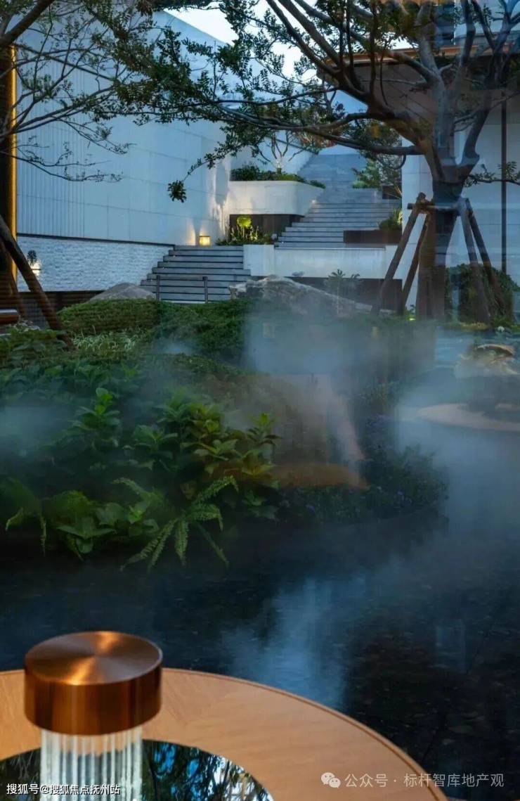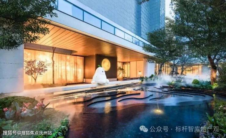 约500㎡水景,以三层渐变奢石构景,层层叠叠,颇有层次感。旁边墙体镶嵌着一轮“圆月”,与前方水景呼应,形成“海上生明月”的悠然意境。通过林溪步道,就可以到达社区架空层首层。