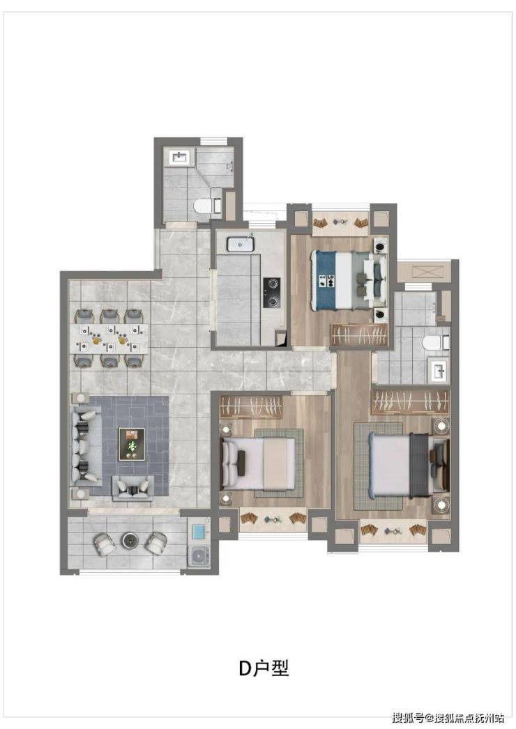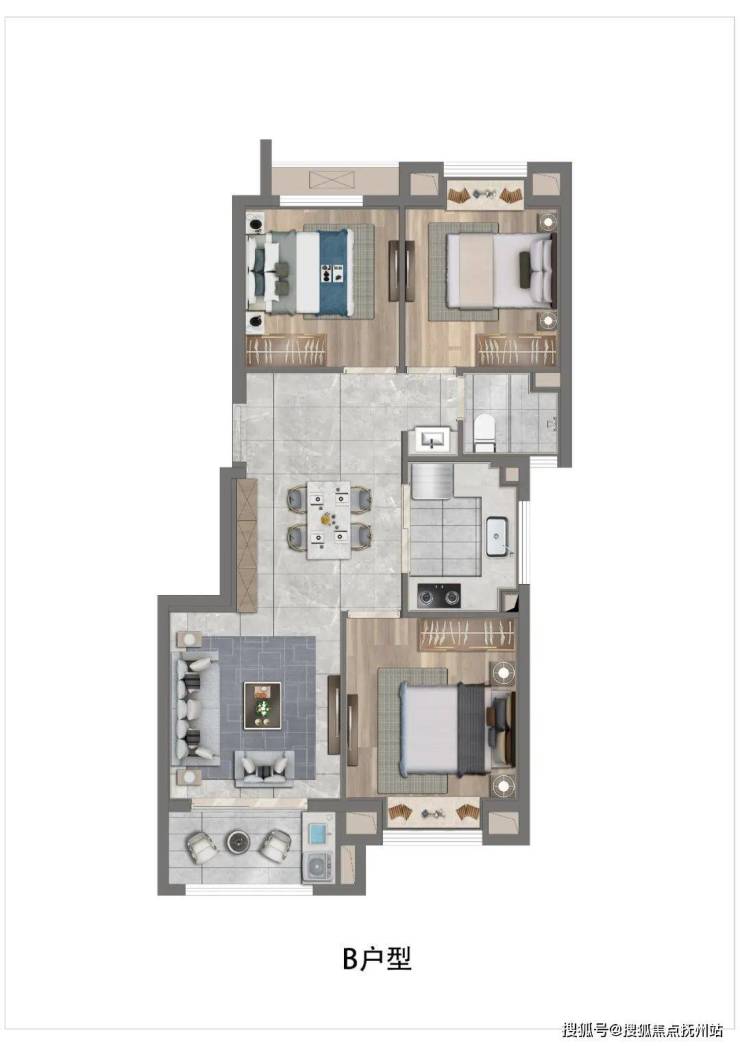但这个户型是洋房产品,得房率很高,再加上层高约3.1米,室内丝毫不见局促感,很符合三口之家偏改善或者是二胎家庭的居住需求。