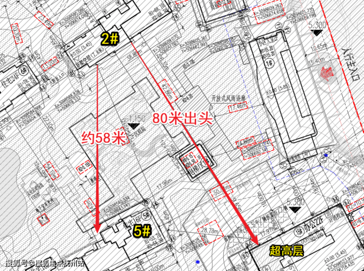 同时,2#东南侧为高约100米的超高层办公楼,且二者间距大概80米出头,预计大寒日上午7点半到11点期间,超高层的投影会自西向东扫过2#,不过日照整体影响不大。