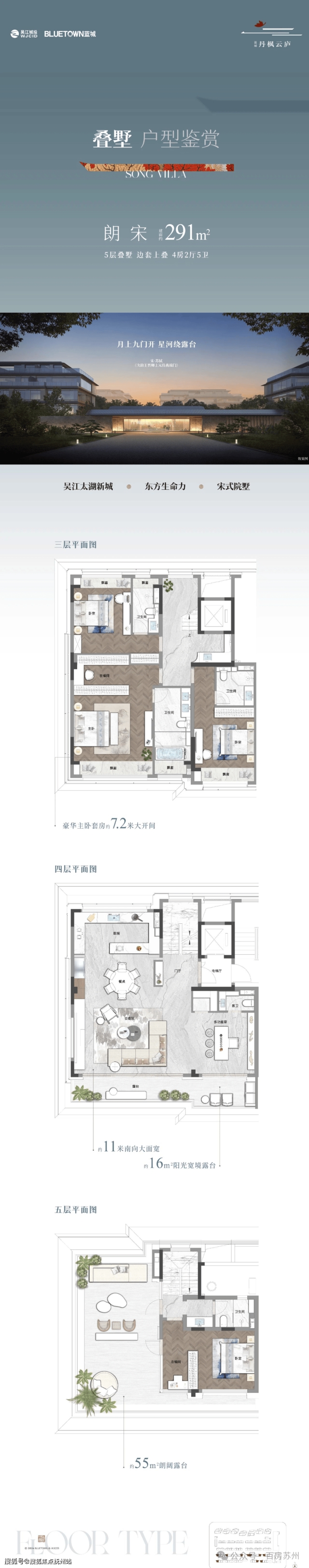 2024年,蓝城带着苏州桃花源的原班人马回来了,这回在苏州湾最精华的吴江太湖新城打造了蓝城首个高端东方院墅。这块地6.9万方,容积率1.6很低,总共17万方的建筑面积,规划了11栋5层叠墅、12栋7层叠墅和7栋16-17层的小高层,面积从169平到300平不等,无论是想要大平层还是合院,这里都能满足。