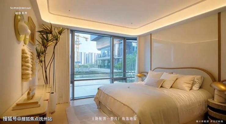 南向三个卧室,主卧配置一整片广角落地窗,约270°的弧形设计像把天空和园林剪下一块。