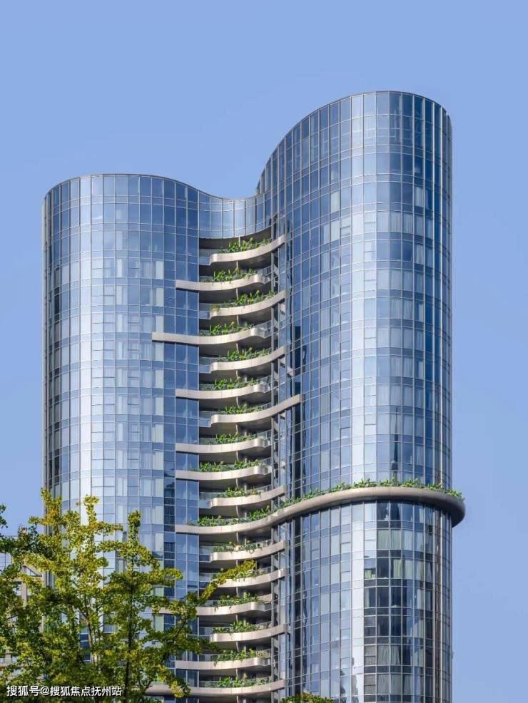 维持建筑原有结构的弧线美感,并将其由鸟瞰视角的美延续至人视可见的街景。建筑形体如两座耸立秀美的茶山,散发杭州特有的气质。山形建筑之下,裙楼屋顶被整体设计为开放式花园,使建筑、绿植、公共景观相互串联,成为隐藏在城市中的桃源绿谷,为使用者提供独特的空间体验。