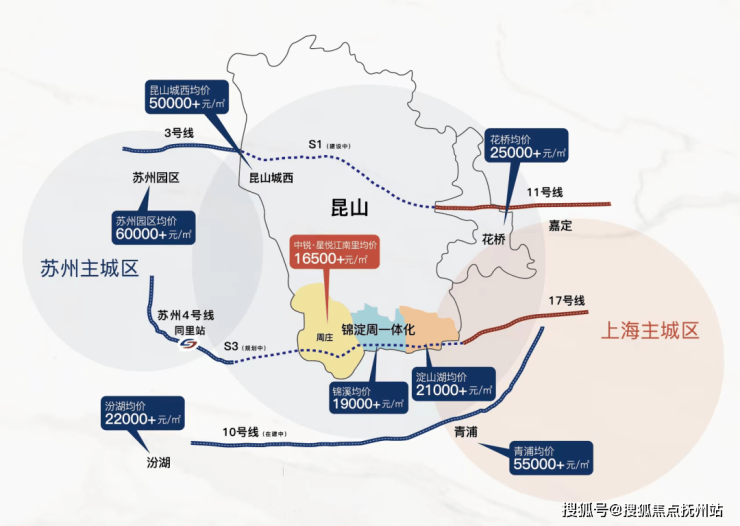 项目地处苏昆沪重要交界处,虹桥西向,零距离对接上海,轨交S3号线(规划中)途径于此,东连上海轨交17号线漕盈路站,西接苏州轨交4号线同里站,是环沪地铁沿线值得臻藏的价值高地。