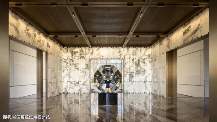 归家大堂被做成了极具东方意境的“金玉满堂”:定制的“缘起”艺术品、地面的静雅棕奢石、悬垂四周的水墨玉石墙,每一寸肌理,都散发着奢玉的温润与高雅。