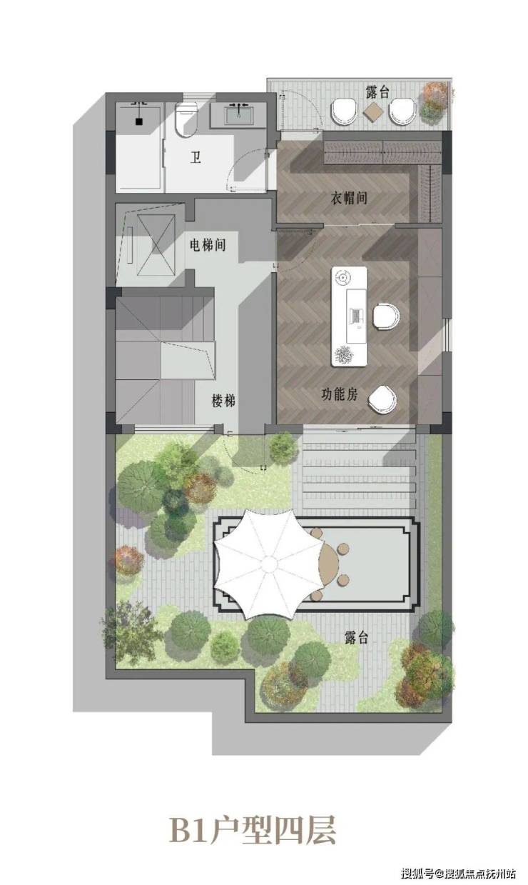 除了天地庭院、全明地下室,B1户型不得不提的是它的四层星空露台。如果你以为它仅仅是预留了一个敞开式的空间的话那就错了。B1户型以边套的优势转角资源,首先为居者打开270°的超广角视野,可纵览城市灯火;其次,B1户型将整个4层都规划成为了独立的休闲区,在功能设计上甚至预留了北向露台、储物衣帽间、功能房等区域,可谓自成一派,实用且高级。