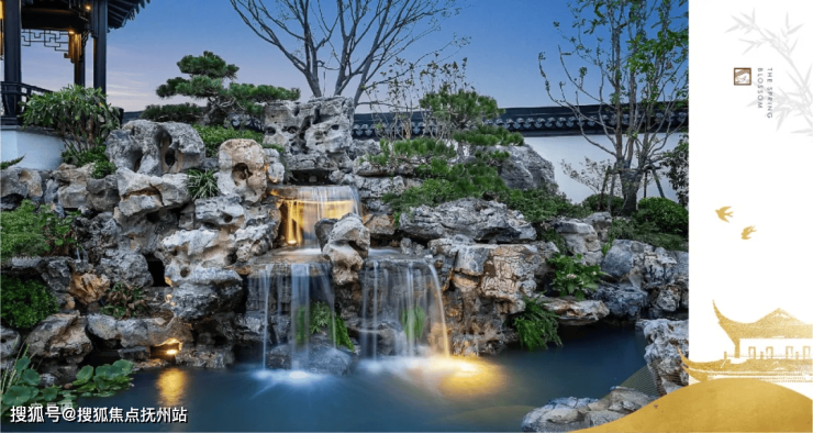 池上架起三折曲桥,延长观景时长的同时打造不同方位的赏湖体验,水面微澜,辉映天光云影。清风拂过,一旁太湖石假山之上,有水成瀑,犹如山涧之中引水落川,一派山水乐趣。因地制宜,遴选珍贵花木丛植园中,绿意掩映之间,寻觅一隅静谧诗意的身心栖所,观四季风光流转。