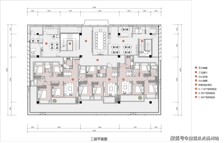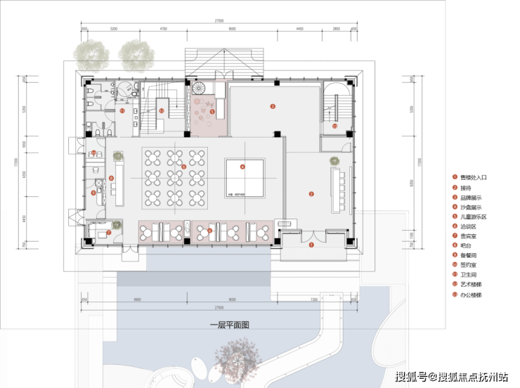售楼处首层主要为接待洽谈空间,二层为样板房展示和办公空间。由入口门头进入接待大厅,然后经过展示区到达大厅(沙盘区域、洽谈区,水吧区、儿童游乐区)经艺术楼梯可到达二层样板间,签约室则位于大厅的一侧。