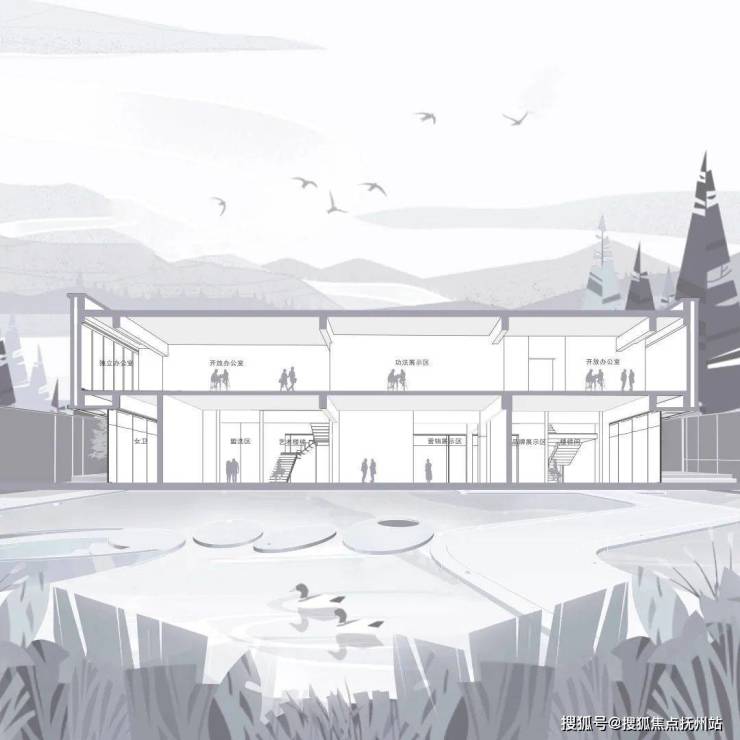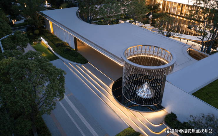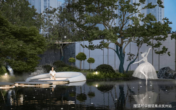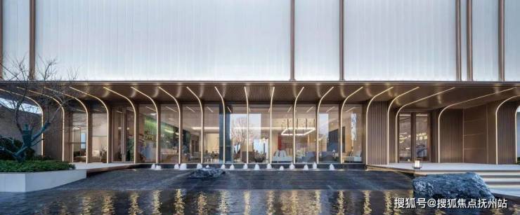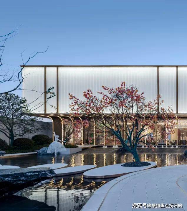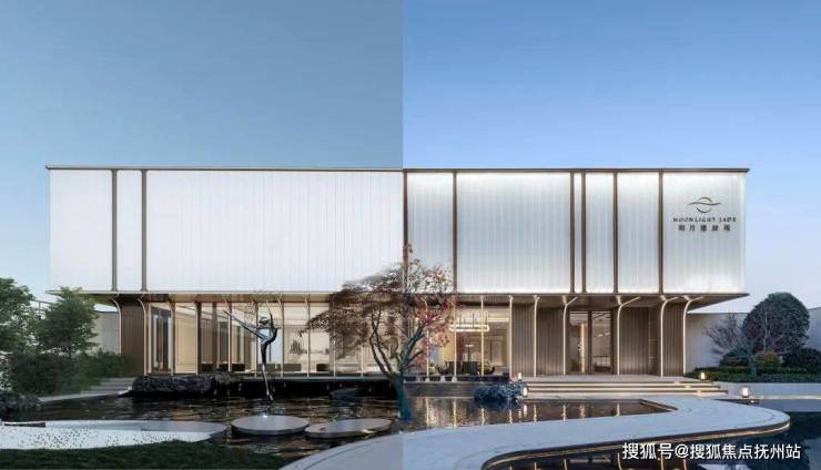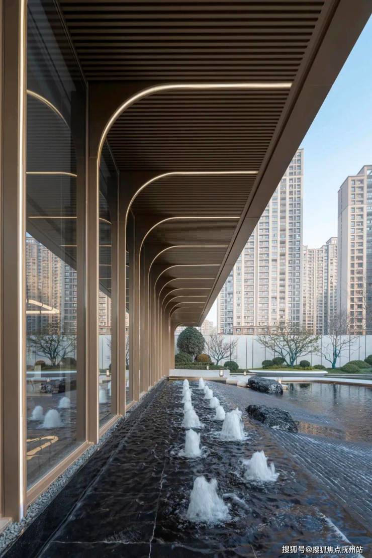 沿街面打造沉浸式的景观界面,外向式布局凸显仪式感。示范区入口营造开合有致的空间,门扉半掩更是是江南婉约美的体现。庭院通过大面积水景打造开阔的空间,体现水乡特色, 营造豁然开朗的视觉体验。