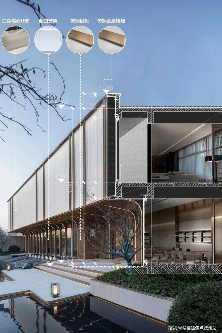 一层的立面材料主要为超白玻和仿铜铝板,二层为双层白色喷砂U玻和仿铜金属格栅。