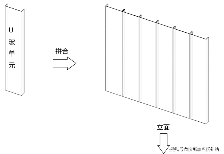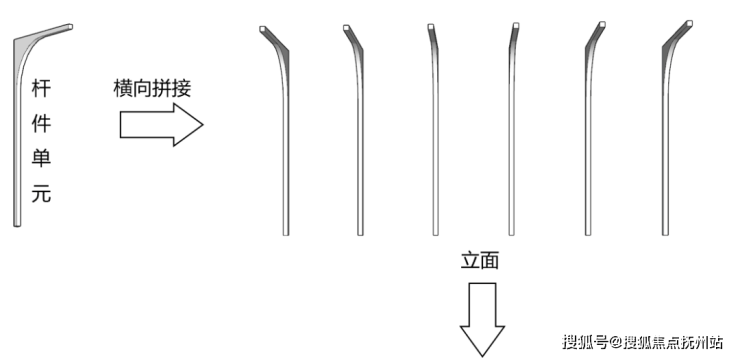 提取扇面竖向匀质排列的肌理应用在建筑上层。