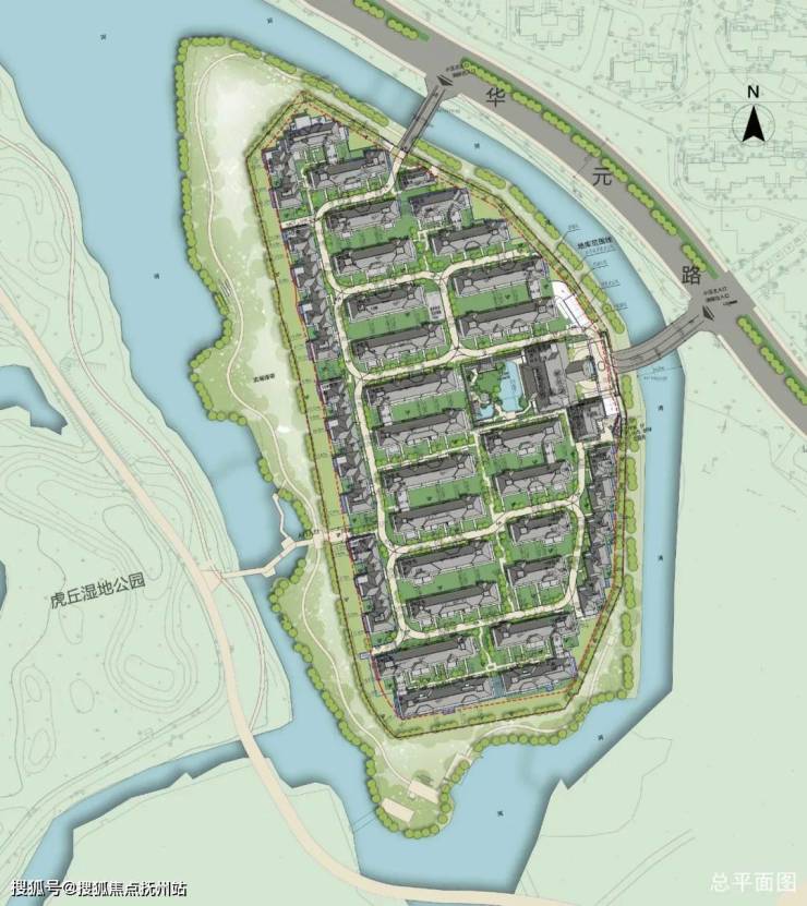 地块四面环水,形态似岛,西侧有道路直通虎丘湿地公园,生态优势显著。