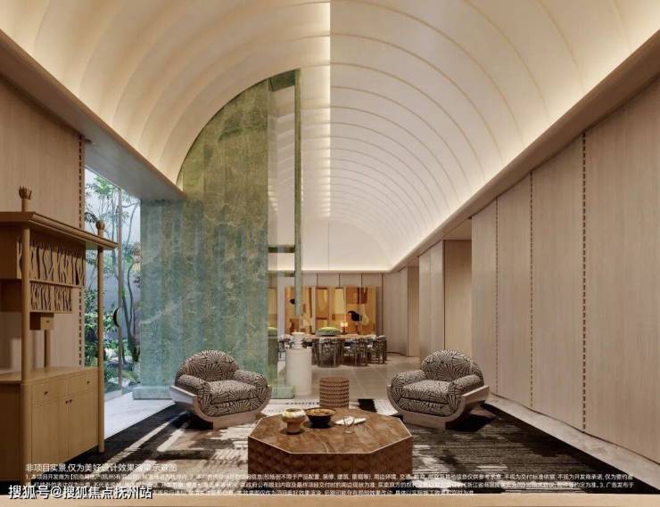 内外双重门厅景墙运用了约1000方顶奢才会用上的月光米黄石材,还是更费料的弧形石材,搭配香槟金线条,与爱马仕全球旗舰店的双曲面叠墙造景手法如出一辙。
