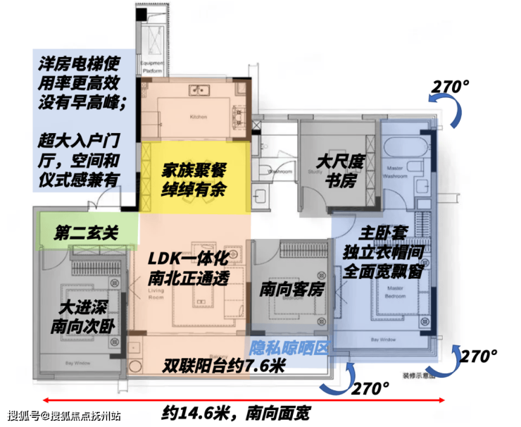 从内部结构看,整个户型没有浪费,每一平米都充分利用到极致。但是又因为设计了私梯入户、第二玄关、隐私晾晒区,又做到了空间和隐私性良好结合。