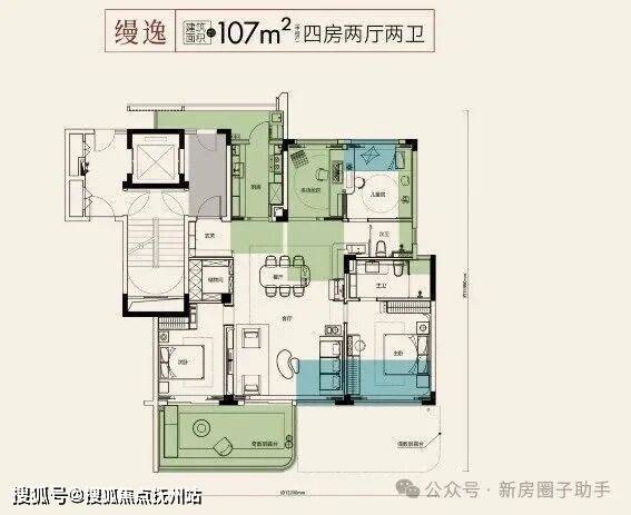 建面约107平四房两厅两卫真四代:不含电梯前室,优化后得房率约130%!