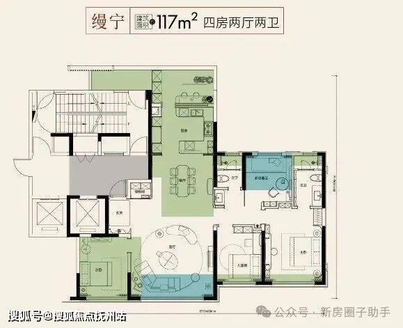 建面约117平的四房两厅两卫:不含电梯前室,优化后得房率约117%!